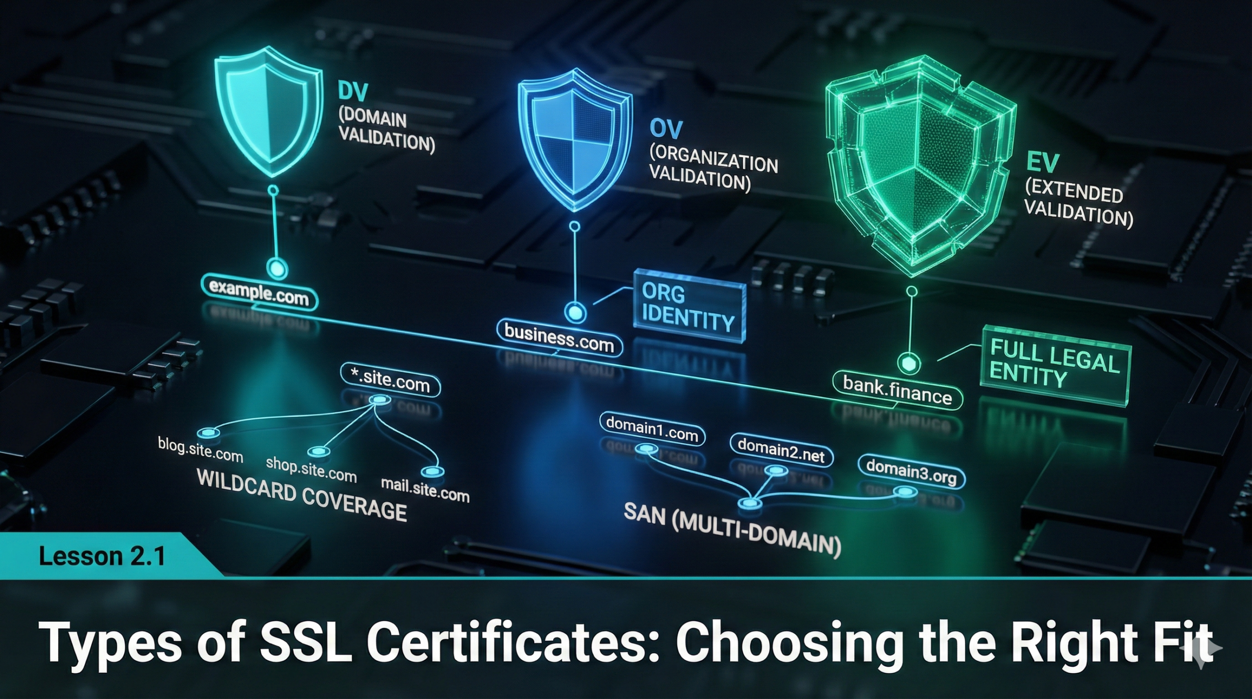 Overview Not all SSL/TLS certificates are the same. This lesson explains the different types of certificates available, what each one validates, and how to choose the appropriate option based on your website’s structure, audience, and trust requirements. Understanding these distinctions helps prevent misconfiguration and ensures the right level of authentication and coverage.